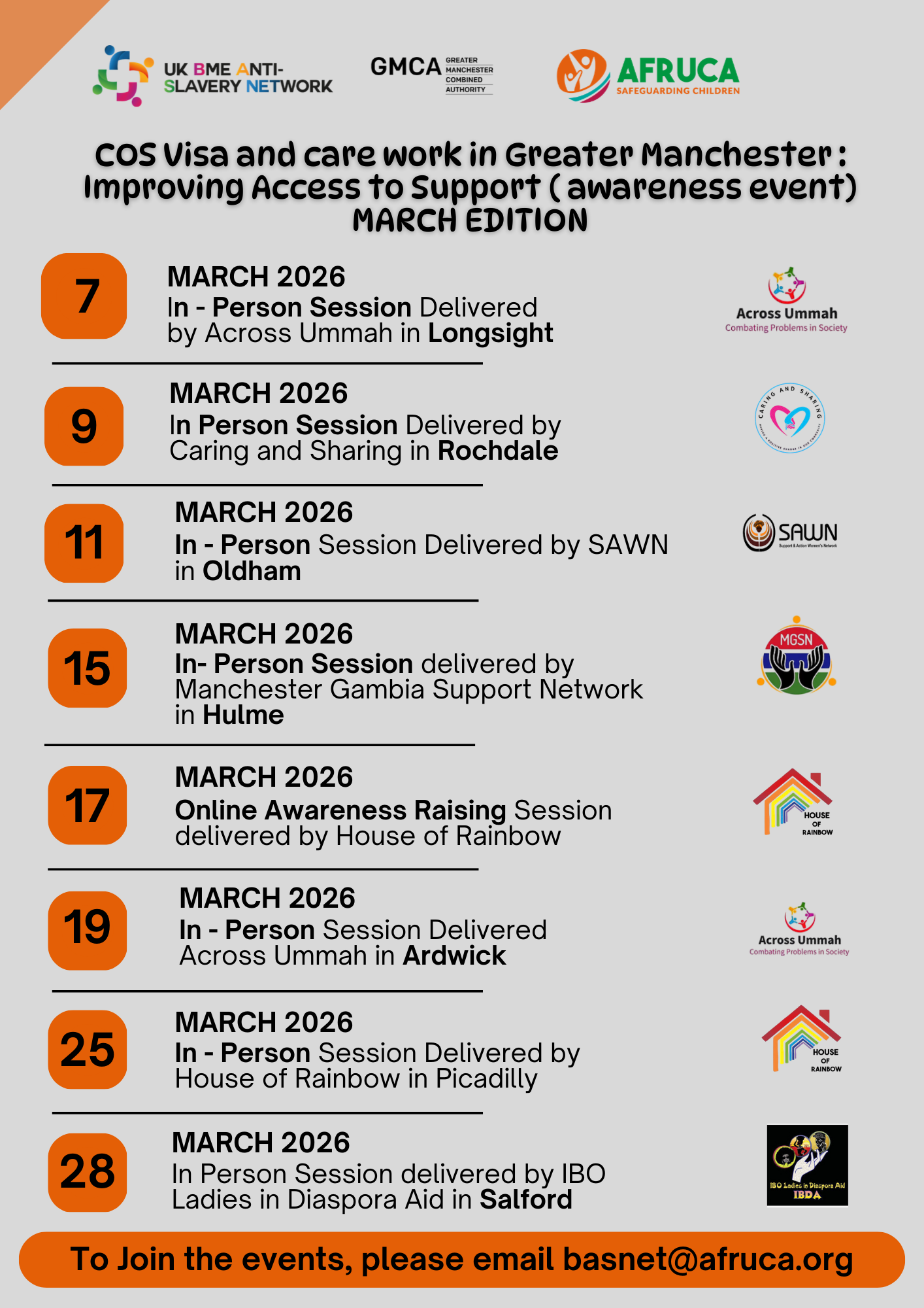 Our project is funded by the Greater Manchester Combined Authority, co-ordinated by our Network BASNET - The UK BME Anti-Slavery Network and will run till end of June 2026. In February 2026, we held five awareness raising events across Greater Manchester and virtually, attracting over 400 participants and resulting in over 50 requests for additional support and signposting to services.