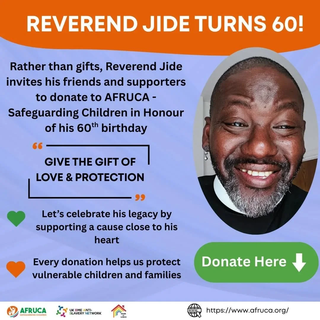 We are delighted that long term AFRUCA friend, volunteer and supporter Rev Jide Macaulay is raising funds for us to celebrate his 60th birthday in November.