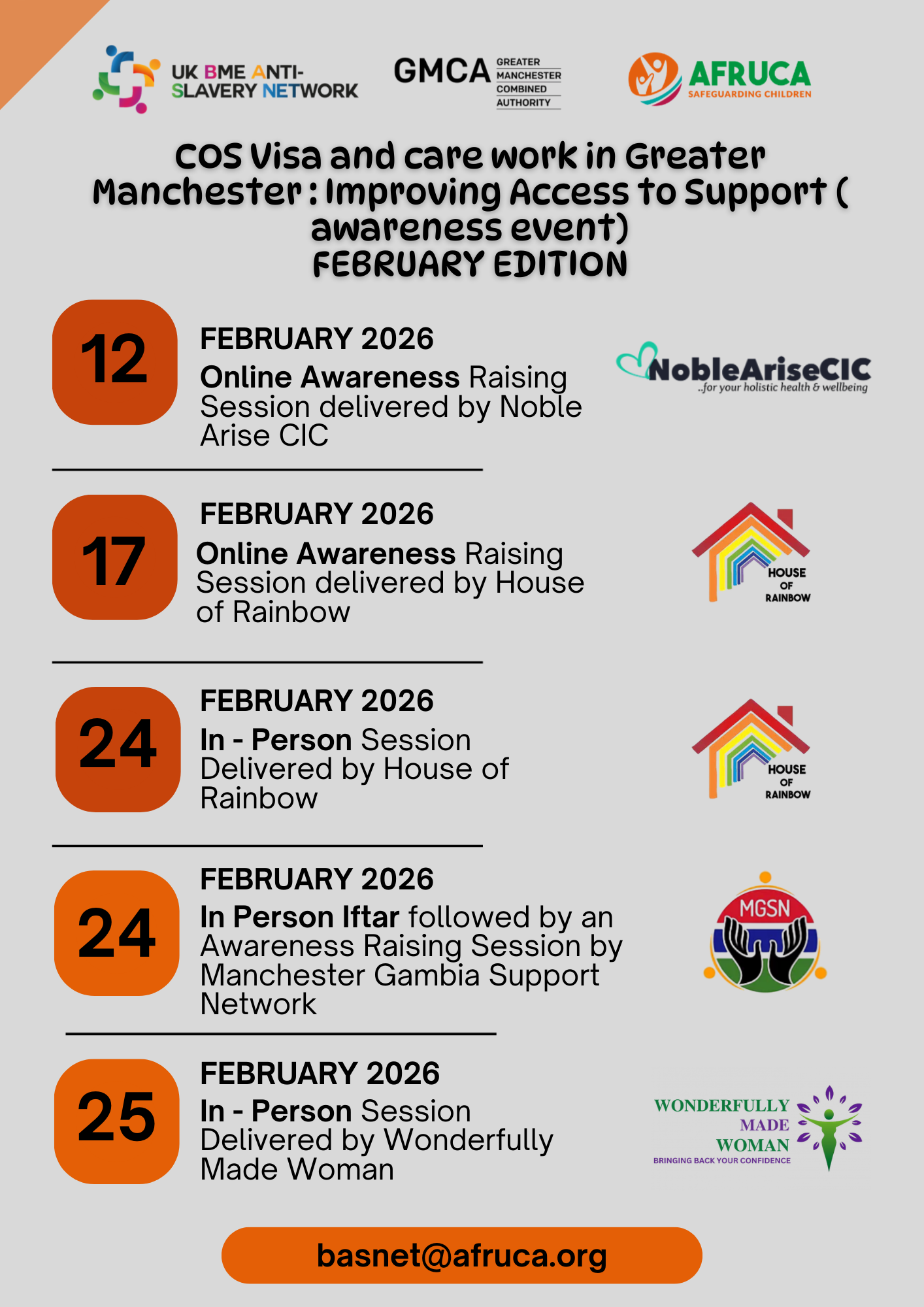 The new project will be delivered by a consortium of nine local partners through our Network - The UK BME Anti-Slavery Network and includes: Wonderfully Made Woman, Support and Action for Women’s Network, Caring and Sharing CIC, House of Rainbow CIC, Manchester Gambian Network, Across Ummah, Ibo Ladies in the Diaspora and Noble Arise.