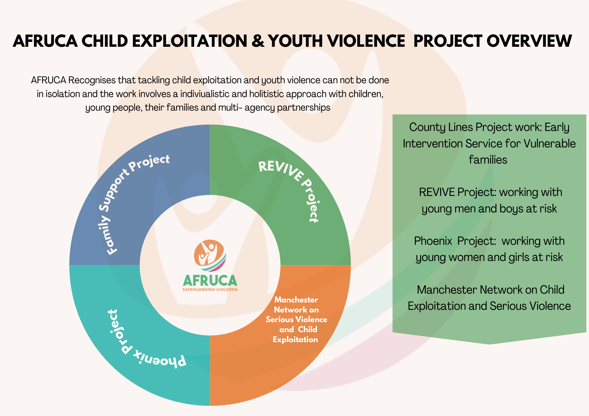In partnership with Manchester City Council, AFRUCA delivers a holistic menu of services to support children and families in Black and ethnic communities across the city at risk of or affected by exploitation and youth violence. Our Child Exploitation and Serious Violence Programme includes an Early Help Support Programme For Black and Ethnic Families Affected By County Lines Child Trafficking, a Coding Project for Children at Risk of County Lines Child Trafficking (completed), our REVIVE project for boys and young men at Risk of Exploitation and Serious Violence and the Phoenix Project for Young Women and Girls at Risk of Exploitation. We have also established a Manchester Network on Child Exploitation and Serious Violence as a grass-root led forum to share learning and advocate for change